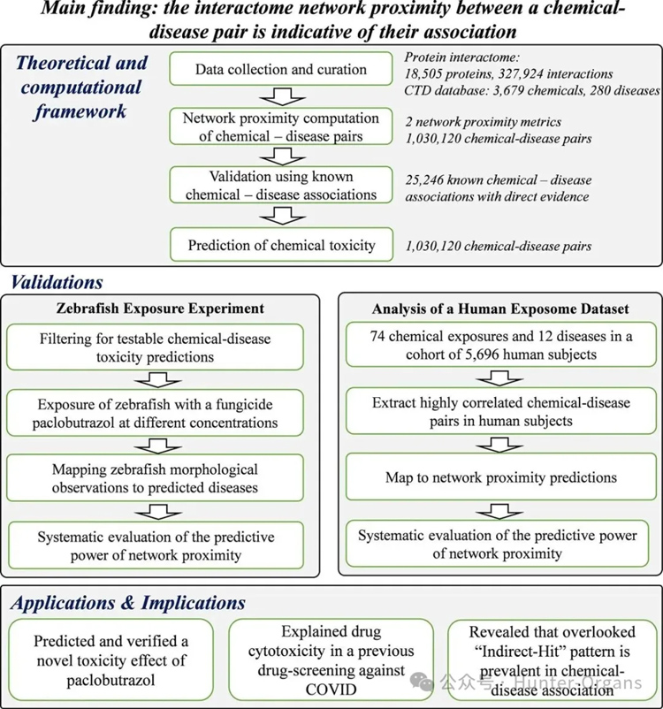本研究成功建立了一个基于人类蛋白质互作网络(PPI)框架的化学药品共性毒理理论和毒性预测方法,不仅揭示了化学物质靶点与疾病模块的网络接近度是其毒性的通用标志,还通过斑马鱼急性毒性实验和人类暴露组数据分析,双重验证了新毒性、解释了复杂药物筛选结果,并首次系统性地揭示了“间接命中” 在化学毒性中的核心地位,构建了 “理论(网络科学)-验证(实验/临床数据)-应用(预测与解释)” 的研究范式,为理解化学物质的健康风险、优先评估潜在有毒化学品以及开发更全面的毒性预测模型奠定了重要的理论基础与方法学框架。