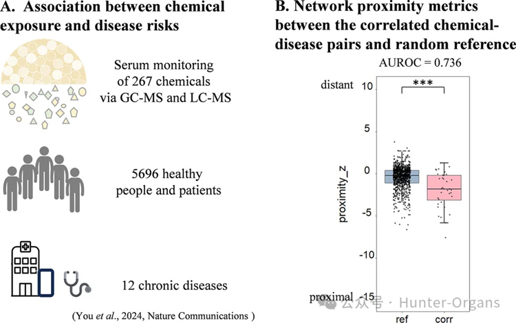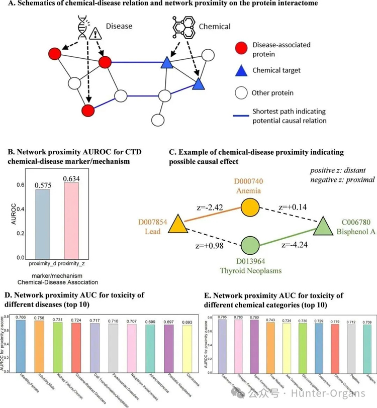 随后,研究人员进一步利用已发表的人类暴露组(Human Exposome)数据分析,包括267种血清化学物质、5696名受试者及12类慢性疾病,提取其中74种高频检测化学物质与疾病之间的36个显著正相关对,证实了36组具备显著相关性的化学品-慢性疾病对符合网络邻近规律。在人类暴露数据中,与疾病显著相关的化学物质-疾病对,其网络接近度显著低于随机预期,AUROC为0.736, p值小于0.001,证实了框架对慢性疾病风险的预测价值。